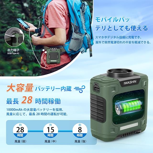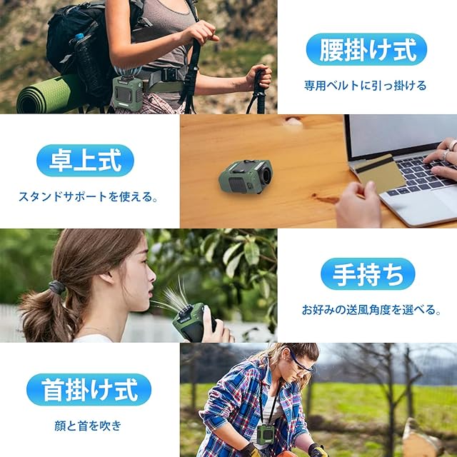 腰掛け扇風機 強力 ベルトファン 10000mAh大容量 超強風3段階風量 8~28時間動作 ブラシレスモーター採用 SOSライトと懐中電灯付 Type-C5V/2A急速充電 USB-A5V/2.4A出力 小型軽量 熱中症 暑さ対策 省エネ 屋外 配達作業 (グリーン&ブラック)