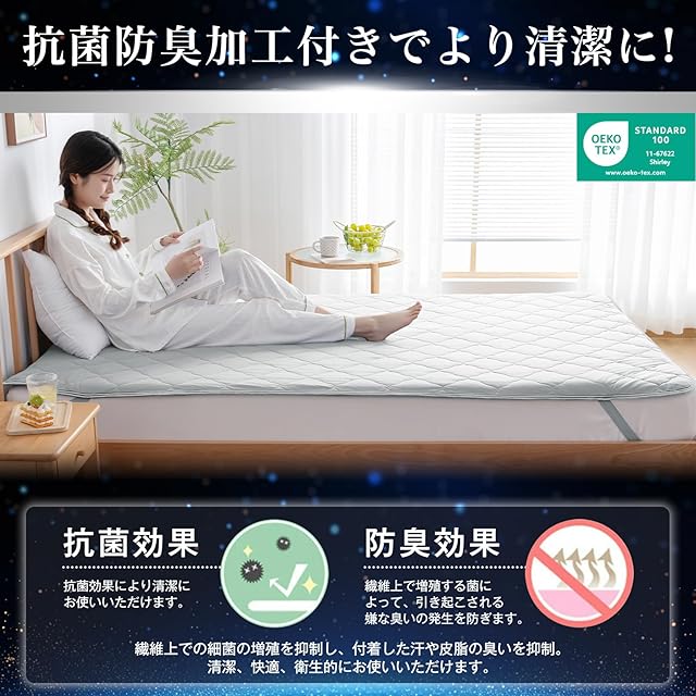 【四隅にゴムバンド付き】四隅にはズレ防止の強化ゴムバンド付きなので、寝返りでもずれにくく、使用中にズレるストレスを軽減します。ベッド/マットレス/敷き布団にしっかり固定して、朝まで安心してお休みいただけます。お手持ちの敷布団、ベッドマットレスに簡単に着脱、取り外しできます。