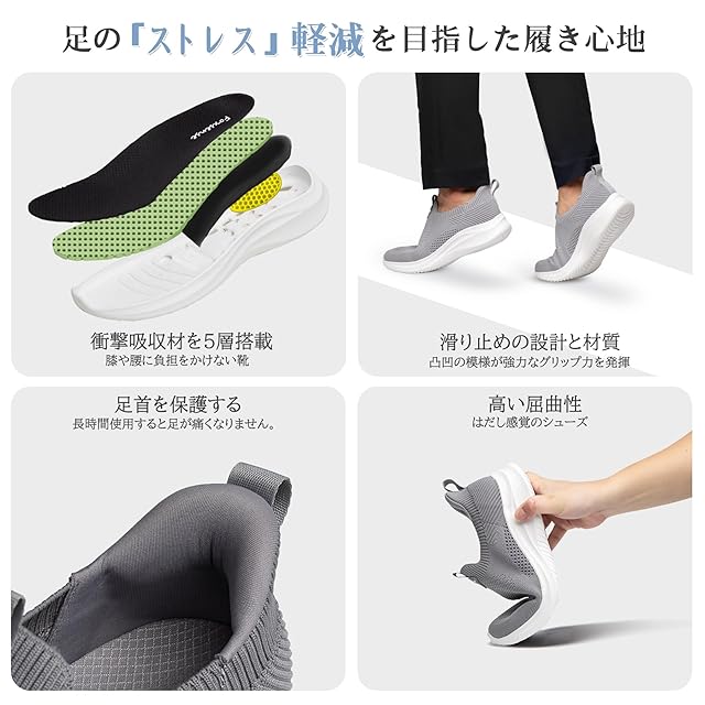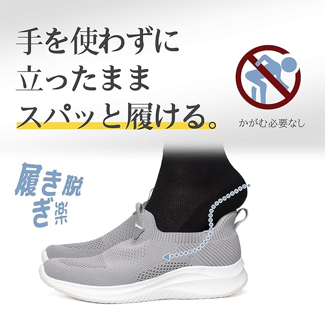 [フォクスセンス] スニーカー 【立ったままスッと履ける 手を使わない 理学療法士推薦】 ウォーキングシューズ メンズ レディース スポーツシューズ ランニングシューズ ローファー カジュアルシューズ 紐なし 世界一快適 通勤 歩きやすい 立ち仕事 軽量 グレー/ホワイト 25.5cm T1508-03