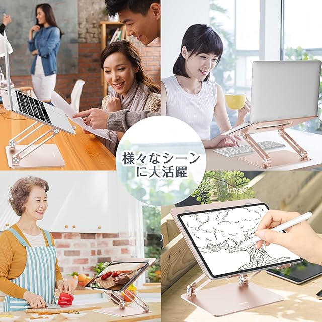 【優れた安定性&正しい開き方】●BoYata PCスタンドの角度調節は多少力がいりますが、成人女性でも問題ない程度です。逆に、調節に力が必要な分しっかりしているので、使用中に下がってくるようなことは無い、頑丈で安定しています。回転軸部分は耐腐食性を高めるアルマイト処理で、摩擦に強く、角度や高さが自由自在に調整可能ですが安定感も抜群です。ご注意:スタンドの左右側面から開くと、力が平均しないとスタンドが揺れやすいので、左右の代わりにスタンドの真ん中から開いてください。
