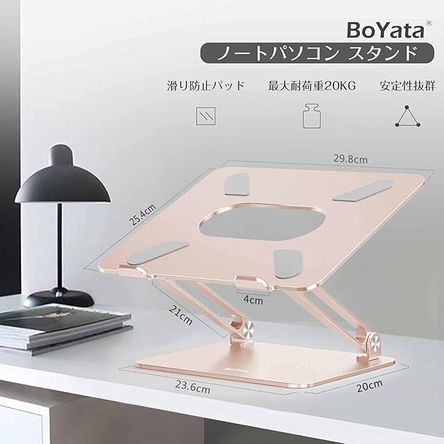 【無段階角度・高さ調整可能】●人間工学に基づいて設計により、PC作業時、角度・高度を無段階調整可能で自分に最適な高度まで調整できるパソコンスタンド!●デスクが低いためデスクワークの際に腰に負担がかかってしまっていたが、Boyataスタンドを使うことによってパソコンを目線と同じ高さにする事で背筋が伸び、猫背などを有効に防止、背中が丸まりにくくなって、リモートワーク時代の必需品 !!