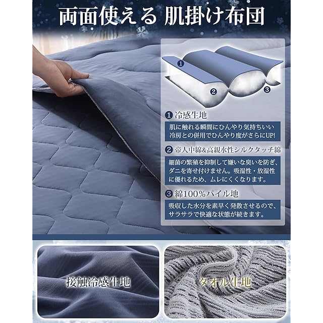 【オールシーズン使える】ひんやり快適な接触冷感と肌触りなめらかなタオル地のリバーシブル掛け布団。夏は1枚で肌掛け布団として、寒い時期は合い掛け布団や掛け布団と組み合わせてインナーケットとして、オールシーズン心地いい肌触りをお楽しみいただける肌掛け布団です。中綿は吸水速乾性の高いポリエステルを使用して、通気性も優れています。