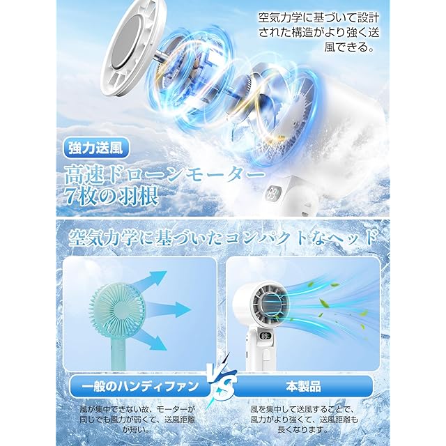 ✨【ファンヘッドが160°調整可能・コンパクトなのに強力送風】本携帯扇風機のファンヘッドは160°調整可能で、卓上扇風機や首掛け扇風機として使用する時にご自由にお好きな角度で風を吹くことができます。また、7枚の羽根が搭載されていて、特別に設計された風道に合わせることでより涼しい風を吹き出します。