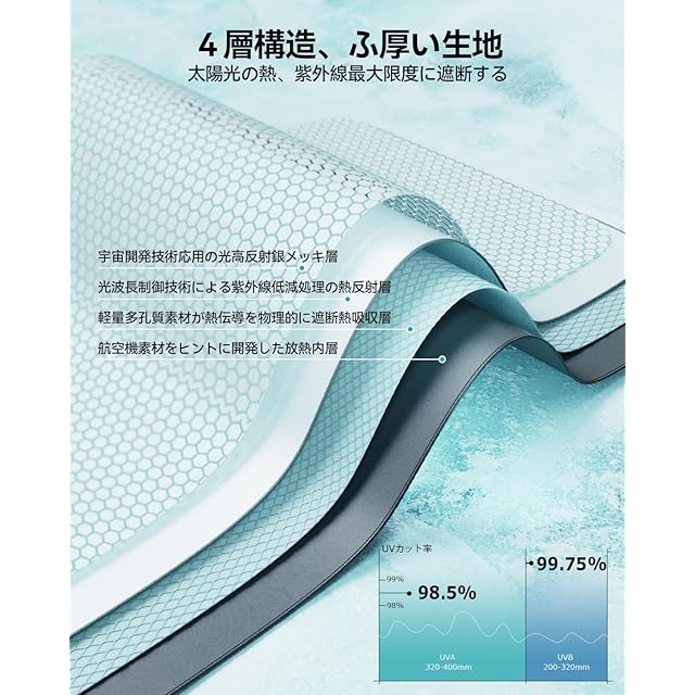 【夏場愛車のアイテム&断熱性アップ】そんなお悩みがありますか。車に戻ると、車内が熱い!内装が、暑さでボロボロ!フロントサンシェードは大幅の紫外線や夏の日差しを効果的に遮断し、内装劣化防止、車内温度の上昇を防ぐことです。エアコンの効率を上げるから、省エネにもなります。真夏の駐車対策!高品質素材を採用され、元の2層構造ではなく、サンシェードは4層構造にアップグレードされました。1層目は大量に太陽光を反射する高品質高密度アルミメッキになっています。2層目はナノ反射特化層、紫外線防止の機能があります。3層目は吸熱、耐燃特化層で、太陽の熱を吸収することができます。4層目はポリウレタンブラック断熱シート採用され、熱を遮断します。