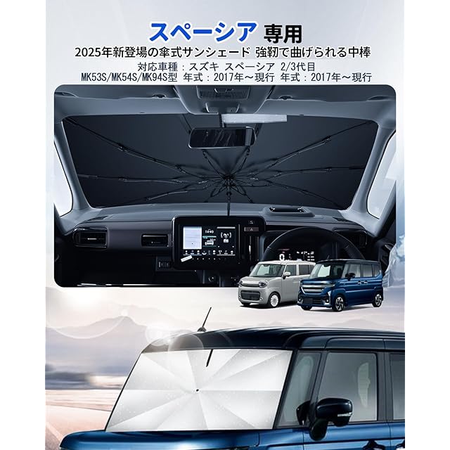 【車種専用傘】LANTU スズキ スペーシア 2代目 3代目用 サンシェード 傘型 MK53S型 MK54S型 MK94S型 折りたたみ式 曲がる傘柄 断熱 UVカット MK94S 車用サンシェード フロント ワンタッチ 収納 暑さ対策 mk54s 日よけ シェード アクセサリー 収納ポーチ付き 10cm露先が折れる可能