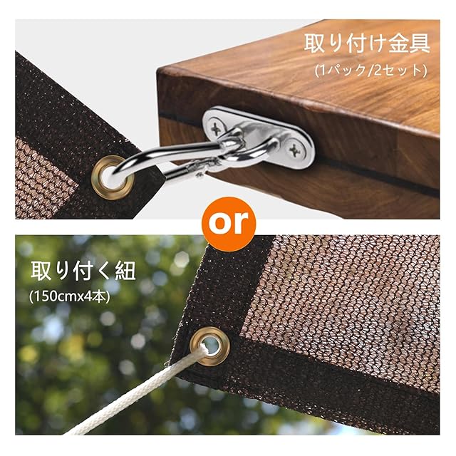 取り付け:錆びないのゴールデンアルミハトメが付いているので、付属品:4本x1.5m取付けひも、ベランダや窓ペ、廊下、庭下、庭先、玄関などに簡単に取り付けることができます。お洒落なデザインなので、日よけだけでなく、ご自宅やお庭のエクステリアとしてもご利用なれます。