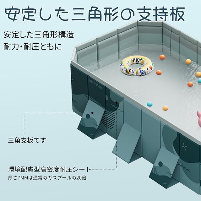 【水漏れ防止・安定した三角構造】厚さ7mmの高強度4層コンポジットでを使用し、底面には3mmの高品質PVC素材を使用しているので、耐摩耗性と耐パンク性、水漏れを防ぎ、従来のインフレータブルプールに比べて3倍以上長持ちします。側面には安定した三角形の支持板を使用し、プールの圧力や変形に強くなっているので、夏の水遊びも楽しくできます!