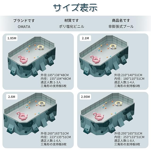 【新昇級 非膨張式プール】スイミングプールのサイズは1.85M、2.1M、2.6M、2.95Mがあり、ご自宅のフリースペースの位置に合わせて適切なサイズをお選びいただけます。プールの外径は295*165*51cm、内径は253*133*51cm、1〜10人を収容でき。大人が伸び伸びと遊べる広々とした深さです。親子で遊び、親子関係を深め、充実した夏休みを過ごすことができます。