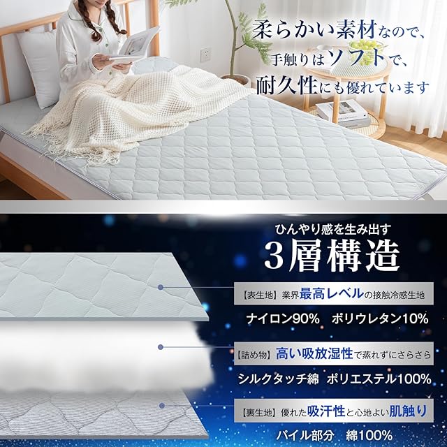 【両面使える】表地にはひんやり心地よい接触冷感素材を、中綿は超柔らかいシルクタッチ綿を使用しています。肌触りが柔らかいです。裏地は吸湿性に優れたタオル地を使用しています。蒸し暑い夏はさわってひんやり接触冷感面、少し寒い春秋、じめじめした日は、通気性が優れたパイル綿生地、肌触りが良いタオル面で使用します。コットンタオルの生地は汗や湿気を吸い取ってくれるので、さらっと快適な寝心地に導いてくれます。また、パイル生地はほぼ一年中ご使用いただくことができるのでとってもお得です。