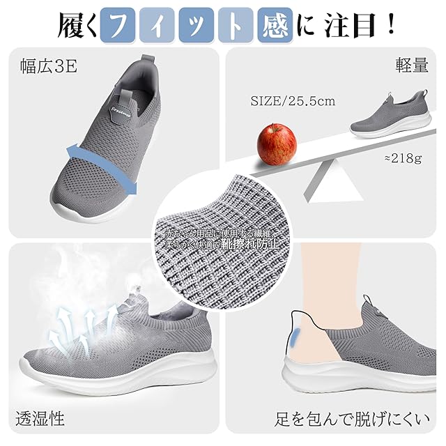 [フォクスセンス] スニーカー 【立ったままスッと履ける 手を使わない 理学療法士推薦】 ウォーキングシューズ メンズ レディース スポーツシューズ ランニングシューズ ローファー カジュアルシューズ 紐なし 世界一快適 通勤 歩きやすい 立ち仕事 軽量 グレー/ホワイト 25.0cm T1508-03