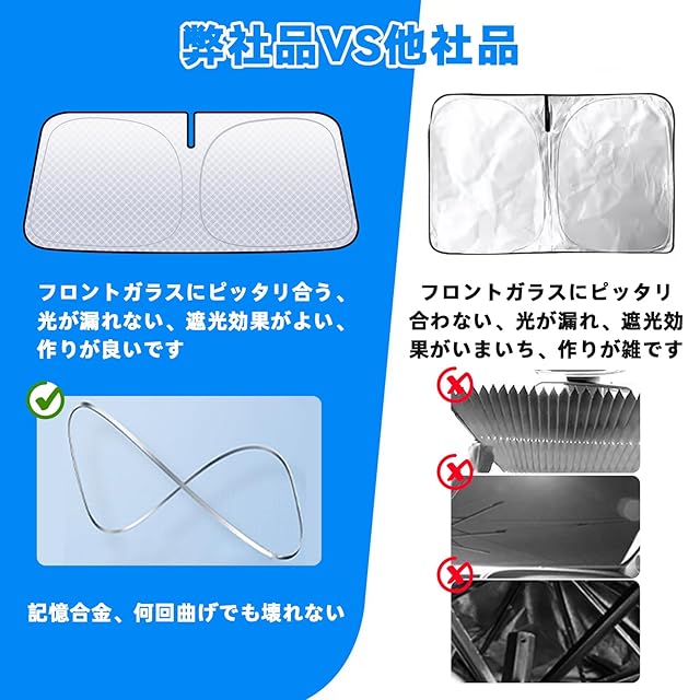 【使いやすい】表面(車外側):シルバー、裏面(車内側):ブラック。使用方法:窓枠にはめ込むだけの簡単取付です。サンバイザーでおさえれば更に簡単に取り付け可能です。跡とかもつきません。収納方法:①サンシェードを二つに折り畳みます。②両端を持ち、8の字に曲げようにひねます。③重ねるように折りたたみ、付属の収納袋に入れて保管します。ご注意:フレーム部分にワイヤーが入っているため、収納袋から取り出す時に折り畳ん状態から商品を開く際に、勢いよく飛び出しますので、十分ご注意ください。
