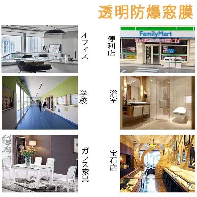 【適用場所】:幅広く使えます。ホテル、政府機関、博物館、銀行、学校、ビジネスビル、病院、戸建て、マンション、アパートなど、室内から貼り付けるタイプなので、高層ビルでも使えます。