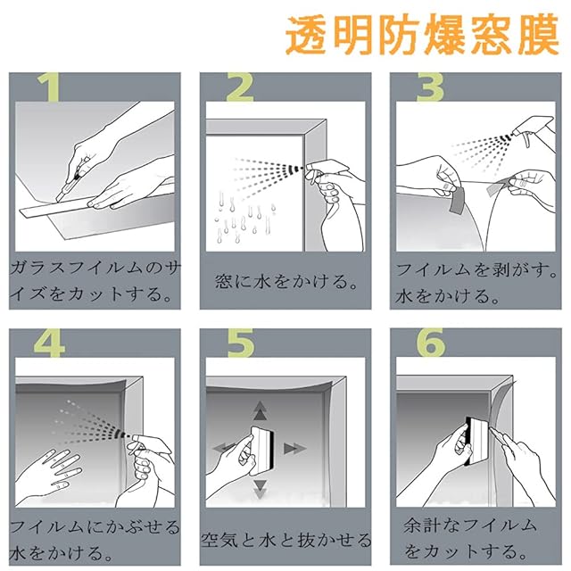 【貼り付け方法】写真にステップがあります。事前に、中性洗剤でガラス面の塵・埃・汚れ等を落とし、ピカピカにしてください。施工しているうちに、窓枠の汚れがたれてきて、汚れが入ってしまうケースもあります。窓枠も綺麗に清掃してください。
