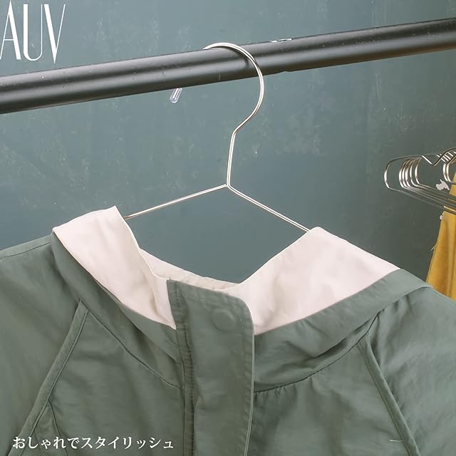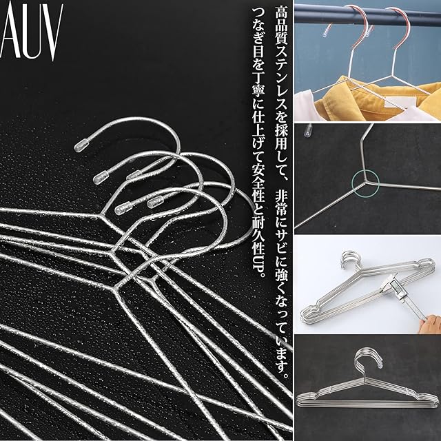 【オールステンレスサビにくい】高品質ステンレスを採用して、非常にサビに強くなっています。濡れた衣服をかけても、浴室乾燥でも、外での長時間の使用も全く問題ありません。長く使える理想的なハンガーです。【つなぎ目を丁寧に仕上げて安全性と耐久性UP】AUVハンガーは、つなぎ目をしっかり加工!壊れにくくしっかりした造りで強度抜群です【先端部分にラバーキャップが付いてさらに安全性UP】先端にラバーキャップをすることにより、衣類にキズつけを防止します。また、滑り止めの効果もあり、ハンガーがポール落下を防ぎます。