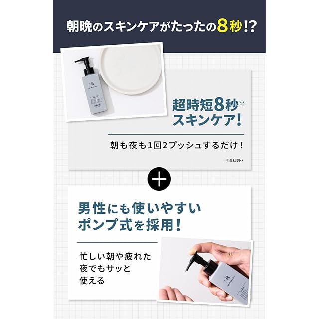朝晩の時短8秒スキンケア!「SNS総フォローワー150万人以上!なーすけくん愛用」。たった1本で、できる男の肌に。スキンケア初心者にも使いやすい化粧水、乳液、美容液、クリーム、フェイスパックの1本5役のメンズ向けのオールインワンジェル。洗顔後の保湿ジェルや髭剃り後のアフターシェーブローションとしてお使い頂けます。