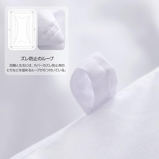 【ピーチスキン加工、やわらかくしっとり触感】肌に優しいピーチスキンの触り心地でしっとり気持ちよく、ムレにくく快適です。ほこりが出にくい、綿切れしにくい、中空ポリエステル綿を使用。ズレ防止ループ付き端の8ヶ所にズレ防止用ループが付いているので、お布団がズレる心配もありません。