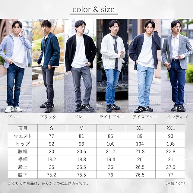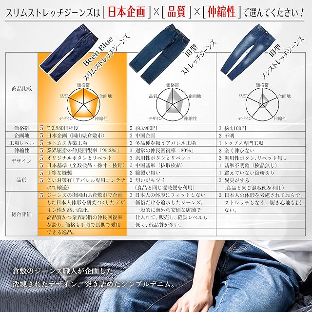 ✅【スリムなのに窮屈感ナシ!体感してほしいストレッチ性の高さ】スリムといえば着圧感があってはき心地がよくない…というイメージがあるかもしれませんが、BEEN BLUEのスリムストレッチジーンズははき心地の良さも追及。 ストレッチ性のある一般的なパンツのストレッチ率が約15~20%なのに対し、BEEN BLUEのスリムストレッチジーンズはなんと大きく上回る38.5%!はいていくうちに身体に馴染むバツグンのストレッチ性を実現しました。