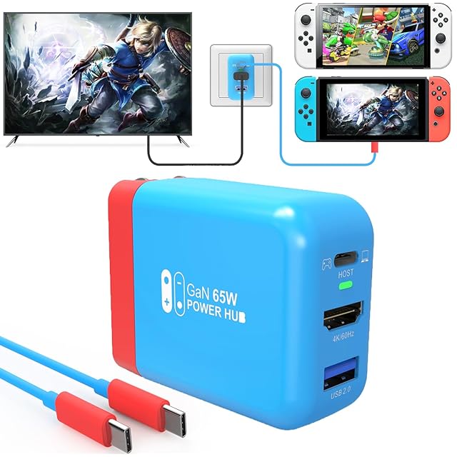【GaN採用革新版/小型化サイズ】TreasLin 65W多機能ACアダプター USB-C急速充電・HDMI パススルー出力・USB-A電子製品接続 Switch充電器+Switchドック代用品TVモード対応 PSE認証済過電流保護 軽量持ち運び便利Type-Cケーブル付き CD0303-B-65W(Blue)