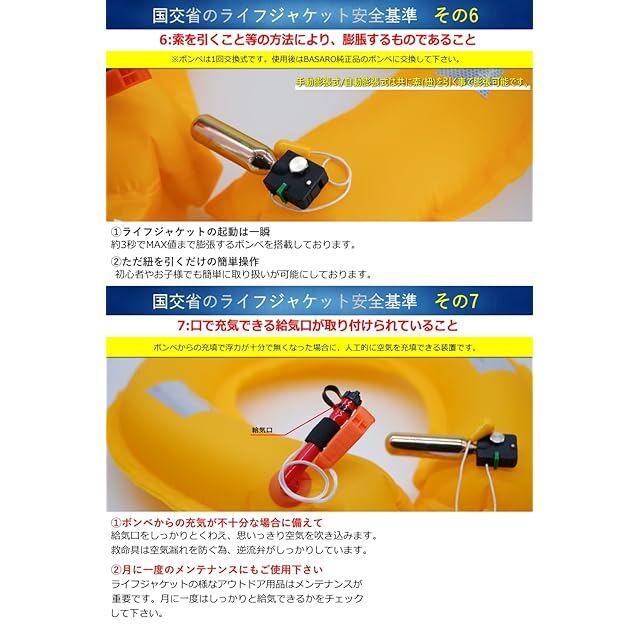 商品情報 手動膨張式ベルトタイプは初心者でも簡単に使用できる様に紐を引くだけで凡そ2〜3秒でMAXまで膨張し一気に浮上可能です。 オックスフォード素材を採用している為、木の枝や岩でもライフジャケットの生地が裂けにくく、汚れも落としやす事が特徴です。 最大110Kgの重さを一気に海面まで引き上げる浮力を持っております。使用環境は真冬-30度〜真夏65度まで正常動作可能です。
