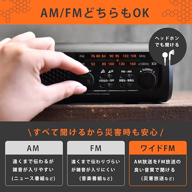 【AMラジオ・FMラジオ・ワイドFM対応】ワイドFMはAMを受信しにくい場所でも電波が届きやすく、防災情報などを聞くのに便利!イヤホンジャック付きで、有線イヤホンを別途備えておけば周囲への音漏れを気にせず聞くことができます。