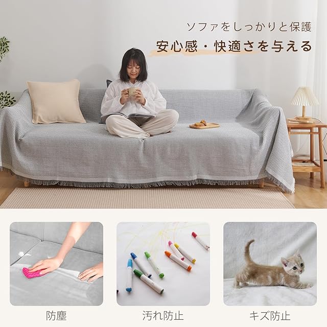 ・【幅広い使用範囲】かけるだけでソファー全体をカバーでき、防塵やキズ防止などの機能があり、ソファーをしかっりと保護できます。多機能で、ベッドカバー、テーブルクロス、冷房毛布、ひざ掛け、防塵カーペット、キャンプカーペット、旅行毛布などとして一年中活躍できます。