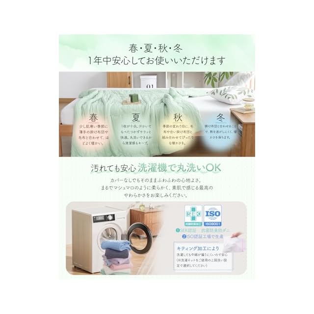 【いつでも清潔&快適】汚れたら洗濯機で丸洗いOK!カバーなしでもそのままふわふわの心地よさが続きます。まるでマシュマロのような柔らかさを素肌で実感。速乾性に優れ、毎日清潔に使えて快適。色落ちしにくく、丈夫な縫製で型崩れの心配もありません。