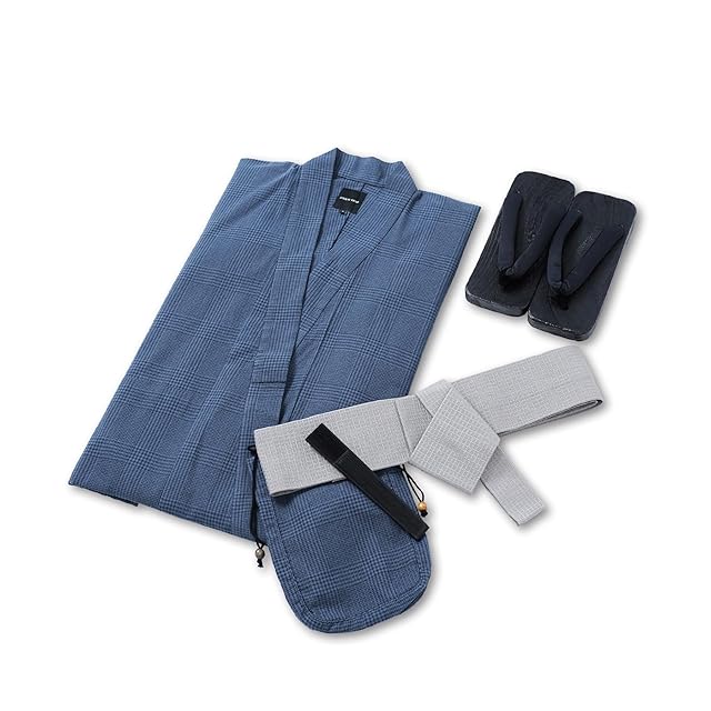 [ロシェル] メンズ 浴衣 6点セット (浴衣 帯 下駄 信玄袋 扇子 腰帯) XS P 藍格子|ワンタッチ帯 簡単着付け 浴衣セット 夏服 祭り 花火 ゆかた 涼しい シンプル 無地 和服 和装 紳士