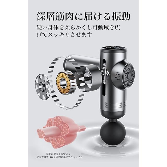 【低騒音・大容量バッテリー】ミュートチップを搭載し、運転音は約 45db で、ファンの運転音よりも小さく、無視ほどの音です。低騒音で、ジムや自宅で使用しても、周りの方にご迷惑がかからなくて、いつでもどこでも使用を楽しむことができます。高出力モーターを搭載し、大容量2000mAhバッテリーとともに、毎日10分の使用で、1の段階で60日間連続使用が可能です。Type-C充電デザインを採用して、充電器、パソコンなどもマッスルガンに筋膜ガン充電可能、電気なしの心配がないです。