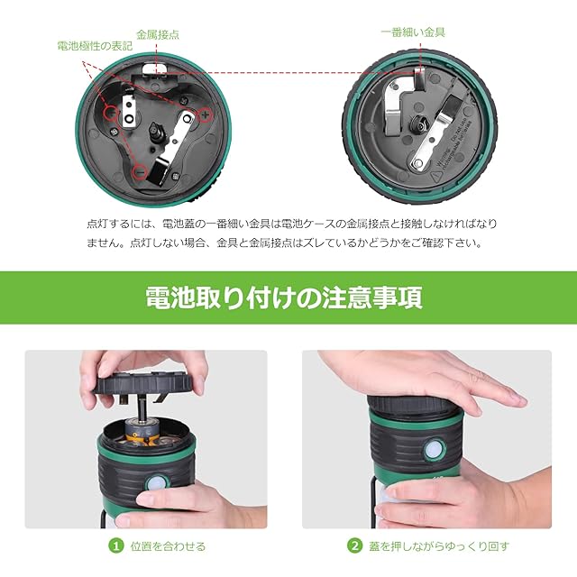 超高輝度・明るさは最大1500ルーメンです。且つ目にも大変優しいです。・点灯時間は、24時間→26時間→13時間の順に点灯。様々な場面で活躍可能。調光&調色・4つの点灯モードを搭載しています。850ルーメン(15灯3030昼光色LED)・650ルーメン(12灯3030電球色LED)・1500ルーメン(ハイ)・赤光(フラッシュ)と調節ができます。・スイッチで場面に応じて無限に調色もできます。防水 ・防水性能IPX4です。・底にある収納式のフックカバーを外して逆さに吊り下げることもできます。 表示灯 ・スイッチ部に小型LEDを内蔵し、緑色の点滅で暗闇でもランタンの位置を通知します。・また、サイズは101mm×190mm、重量は400gです。便利・単一電池3本(別売り)使用の電池式です。 ・持ち運びに便利で、キャンプ・釣り・ハイキング・仕事・散歩等様々な場所に適しています。