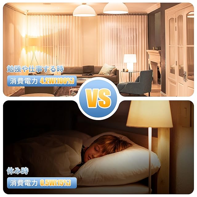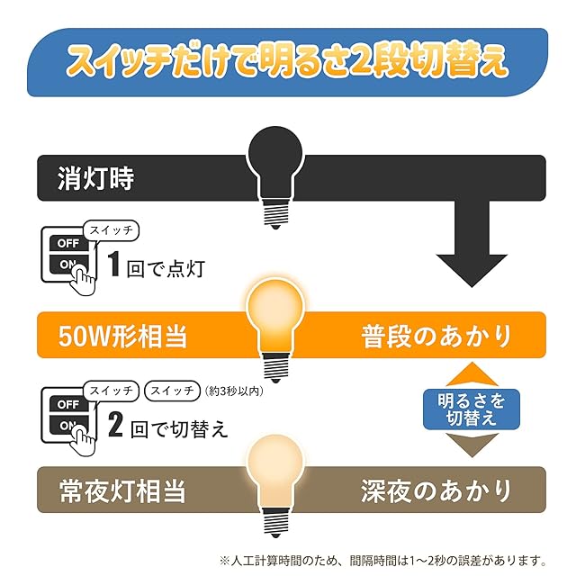 2段階切り替え:壁スイッチで明るさを切り替え、電球の点灯時はスイッチを2回押す(約3秒以内)で明るさを切り替える。使用環境に応じて明るさを調整できます。明るさ変化の順序:100%-15%。全灯モード:家庭の照明や仕事に適しています、常夜灯モード:夜寝るのに適しています。