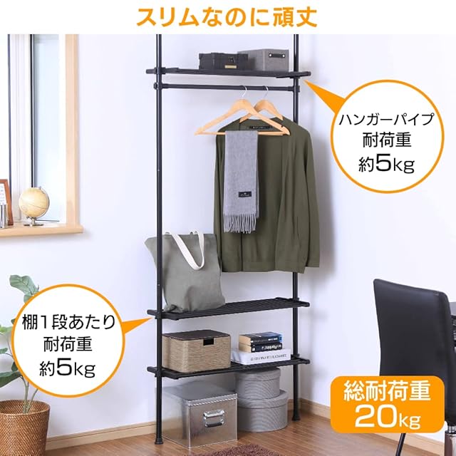 耐荷重:全体約20kg、棚1枚あたり約5kg、棚板3枚、ハンガーパイプ1本