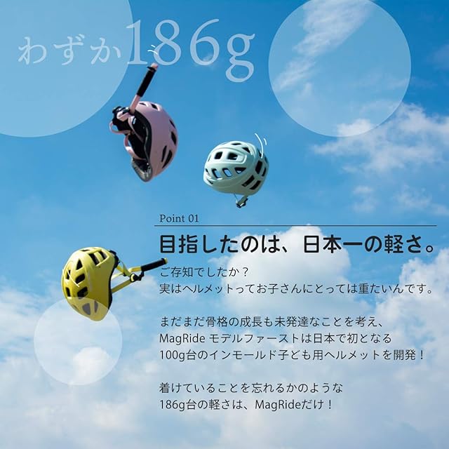 【日本最軽量! 唯一の100g台のヘルメット】MagRide イチハチロクは日本最軽量の子ども用ヘルメットです。1歳からのヘルメットデビュー用に専用設計されたヘルメットで、まだ発達途中のお子様でもイヤイヤしない、をテーマに設計しました。お子様の首への負担も最小限に抑えるため重量を極限まで抑え、同時に競技用ヘルメットと同様の安全設計にこだわりました。
