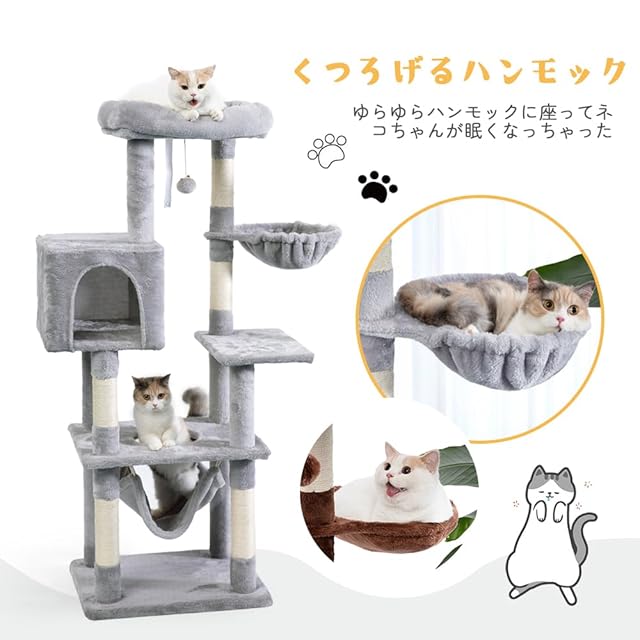AIFY キャットタワー 据え置き スリム 大型猫 中型 小型 ミニ 多頭飼い ハンモック おしゃれ かわいい 爪とぎ おもちゃ 猫タワー ねこ 爪研ぎ 麻紐 子猫 シニア 省スペース コンパクト 140cm グレー