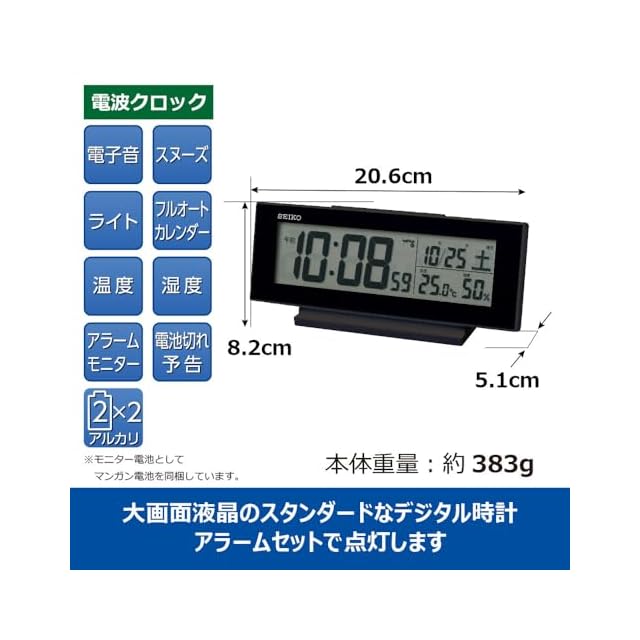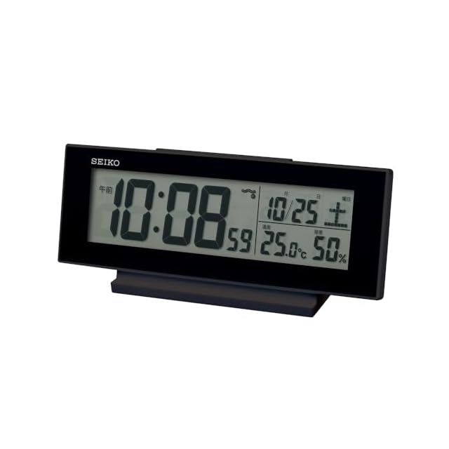 セイコークロック(Seiko Clock) 目覚まし時計 常時点灯 電波 デジタル カレンダー 温度 湿度 表示 夜でも見える 黒・一部黒 82×206×51mm SQ324K
