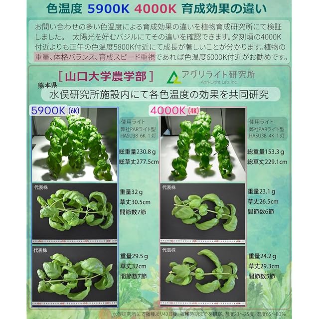 色温度4000ケルビンは暖色系の色合いで暖かみのある光です。植物育成評価は6Kモデルと比較して顕著ではないため設置環境に合わせてお選び頂いて問題ございません。