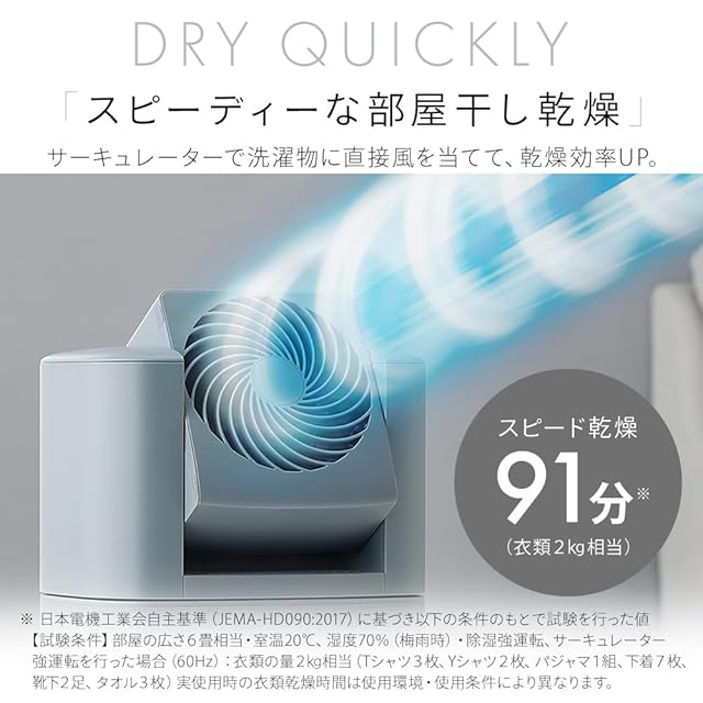 除湿機能:デシカント式 / 首ふり:[左右]90°/70°/50°[上下]水平~90°の範囲を手動調節可能 / 強さ選択(除湿/サーキュレーター):強/中/弱 / 切タイマー:2/4/8時間