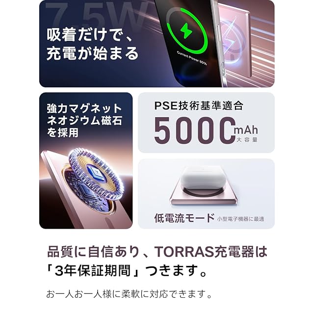 【2025年最強版】TORRAS モバイル バッテリー 超小型 軽量 iPhone かわいい MagSafe対応 マグセーフ充電器 PSE技術基準適合 ワイヤレス充電器 マグネット式 急速充電 5000mAh iPhone12~16 バラ色 プレゼント/旅行/出張