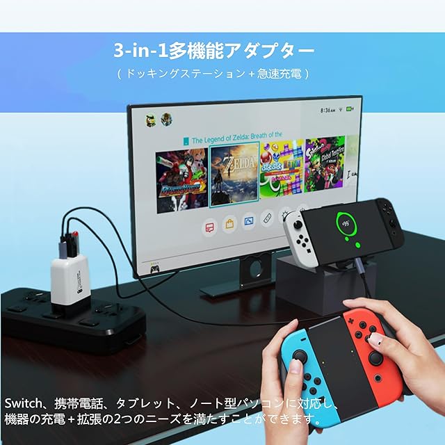 【3口一体化のSwitch充電器】Switchテレビ台座に適用され、HDMI/USB-A/USB-Cポートを内蔵し、3つの機器を同時に挿入することができる。このニンテンドーSwitch Dock充電器はオリジナルのSwitch DockとACコンピュータ充電器アダプタの理想的な代替品で、パッケージには100センチの全機能USB-Cケーブルが含まれており、充電は安全で、効率が高く、HDMI 4 KとUSBドッキング機能を備えており、スムーズなゲームと仕事体験を提供する。