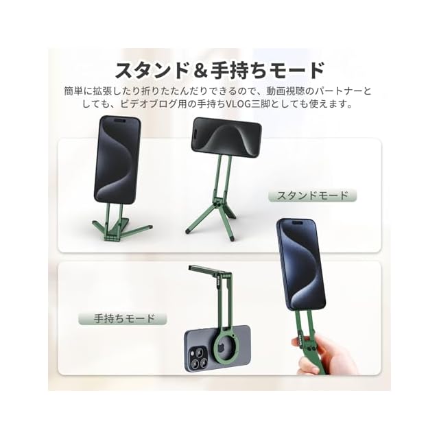 Ulanzi MA30 スマホ三脚 ミニ三脚 全金属製 magsafeに対応 折りたたみ式 持ち運び便利 スタンド&手持ちモード 361度回転 自撮り棒 スマホスタンド 携帯スタンド 安定 軽量 角度調整可能 横置き/縦置き 卓上三脚 セルフィー/生放送/撮影録画/動画鑑賞に最適 グリーン