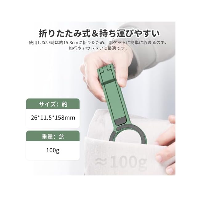【Magsafe用 折りたたみ式 スマホ三脚 】Ulanzi MA30 Magsafe スマホ三脚ではスマホを固定する部分が強力マグネットへ進化しスマホをしっかり吸着固定します。片手でわずか0.1秒簡単に取付可能です。簡単に拡張したり折りたたんだりできるので、三脚としてだけでなく、デスクでスマホスタンドのように使ったり、セルフィーを撮影するために自撮り棒のようにも使えたり、一台で何役もこなす優れものです。軽量ながらも強度の高いアルミニウムを採用し、頑丈な三脚構造と滑り止めシリコンパッドにより、スマートフォンの落下を防ぎます。ハイキングバックルデザイン、フックハング、自由な手、負担のない旅行、いつでも、どこでも撮影を開始します。ご注意:本製品は携帯電話ホルダーとしてのみ使用され、エクストリームスポーツやプログレードの登山用バックルではありません。