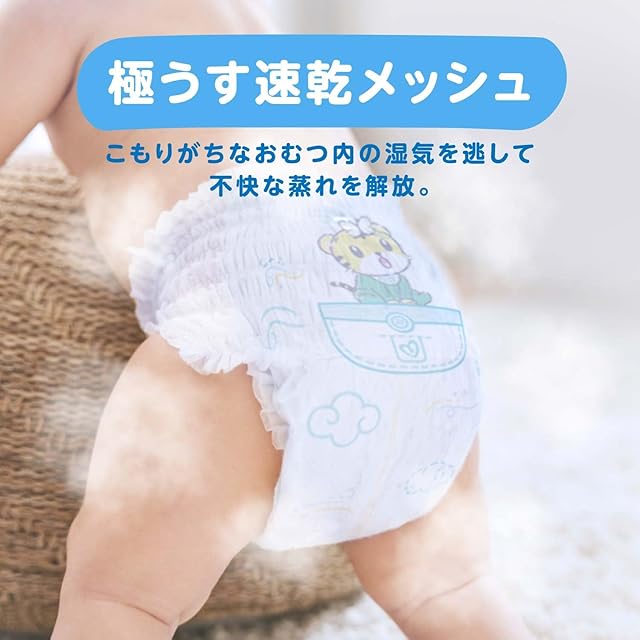 【極うす吸収体】薄いから蒸れにくい。しかも驚きの吸収力。薄さと吸収力を両立しました。Mサイズは背中モレキャッチャー搭載でゆるうんちの背中モレを防止。