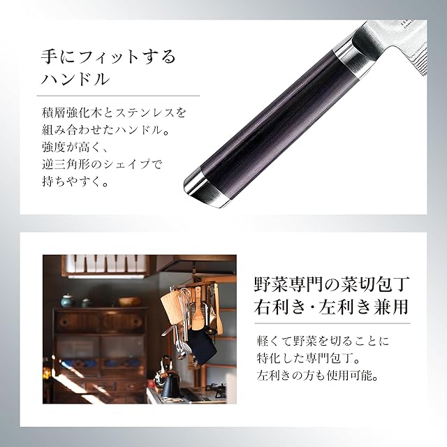 刃体表面は、日本刀を彷彿とさせる美しいダマスカス模様が広がり、ハンドルには手に程よくフィットする逆三角形のシェイプ。