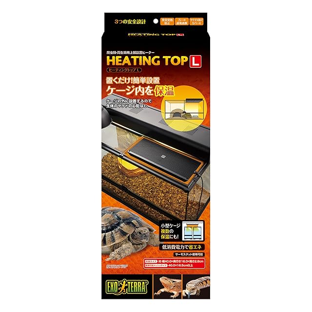 ●爬虫類・両生類用上部設置ヒーター ● 【3つの安全設計】 1.誤使用による発熱防止 間違った設置方法等により本体が異常高温になった場合、サーマルプロテクターが働き通電を制御。 2.万一の通電遮断 サーマルプロテクターが故障した時も、異常高温時は温度ヒューズで通電遮断。(※温度ヒューズが働くと再使用できません) 3.難燃性樹脂カバーつき ヒーター部の高温面に触れにくく、うっかりヤケドを防止 ●サーモスタット使用可能