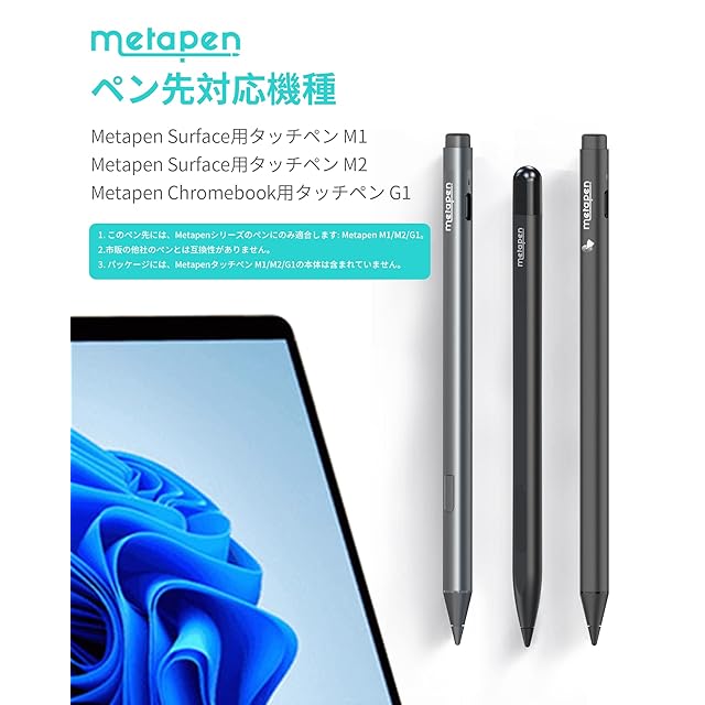 【Metapen M1/M2/G1専用交換ペン先】対応デバイス:Metapen Surface用タッチペン M1、Metapen Surface用タッチペン M2、Chromebook用タッチペン G1。ご注意:Metapenのペン先は、市販の他社のペンとは互換性がありません。 古いペン先を引き出して、新しいペン先を引き込むだけです。 操作が簡単です。何度も抜き差ししないでください。