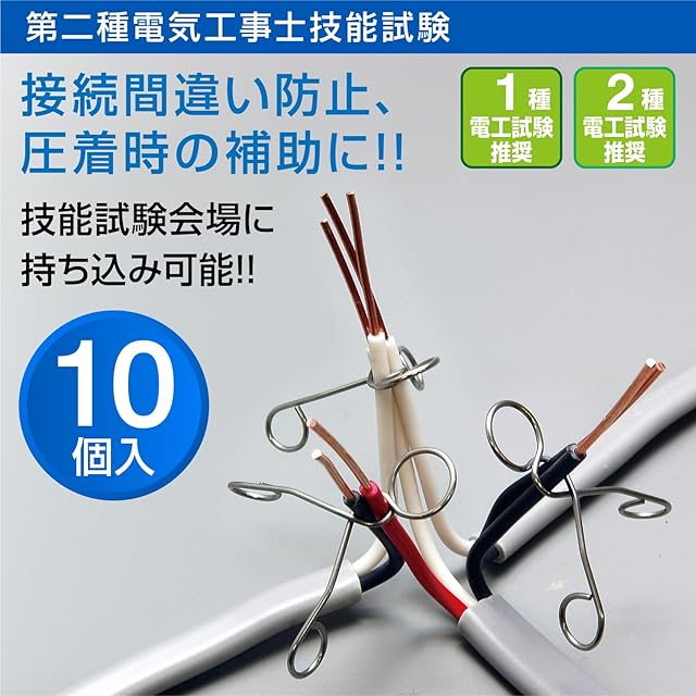 【入数】10個【付属品】専用ホルダー【用途】電気工事士技能試験対策品、電気工事、電線の仮押さえ、リングスリーブのカシメ補助、回路確認