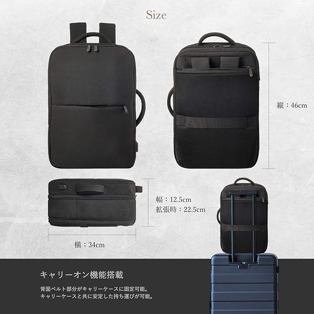 【充実の収納力と機能】 ビジネスマンの必需品に合わせた用途別ポケットが充実。 ・16インチPCまで対応可能なPCポケット(保護クッション付き) ・中には取り出しやすいフリーポケット、貴重品収納に便利なファスナー付きポケットを完備 ・前面には、必要なものをさっと取り出せるフロントポケットあり ノートPCから細かいものまで、これ1つで整理整頓が叶います。 また、マチが12.5cmから22.5cmに拡張可能なため、 荷物が多い日や出張時などもこれひとつでOK。移動を考え、機内持ち込みにも便利なキャリーオン機能を搭載。旅行などでも活躍すること間違いなしです。