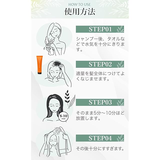 ✅【ご使用方法】1)シャンプーの後に、髪をタオルドライしてください。2)適量を髪全体につけてよくなじませます。3)そのまま5分~10分ほど放置します。4)その後十分にすすぎます。トリートメントは不要です。5)ご使用後は髪をドライヤーで乾かしてください。