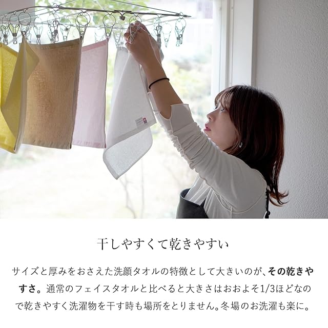 【干しやすくて乾きやすい】 サイズと厚みをおさえた洗顔タオルの特徴として大きいのが、その乾きやすさ。 通常のフェイスタオルと比べると大きさはおおよそ1/3ほどなので乾きやすく洗濯物を干す時も場所をとりません。冬場のお洗濯も楽に。