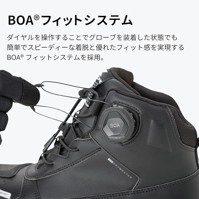 ストリートファッションに合うスニーカーのようなデザインながら、防水性能やプロテクターなどライディングに必要な機能を兼ね備えたライディングシューズ。アッパー内部にはTAICHIオリジナルの防水・透湿素材"ドライマスター"を採用し、全天候での使用に対応。着脱のしやすさと優れたフィット感を実現するBOAフィットシステムを採用。くるぶしまで覆うハイカットタイプで、転倒時でもシューズが脱げにくい仕様に。シューズ内外に配置されたプロテクターが足への衝撃を軽減します。