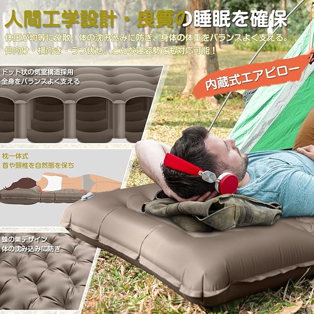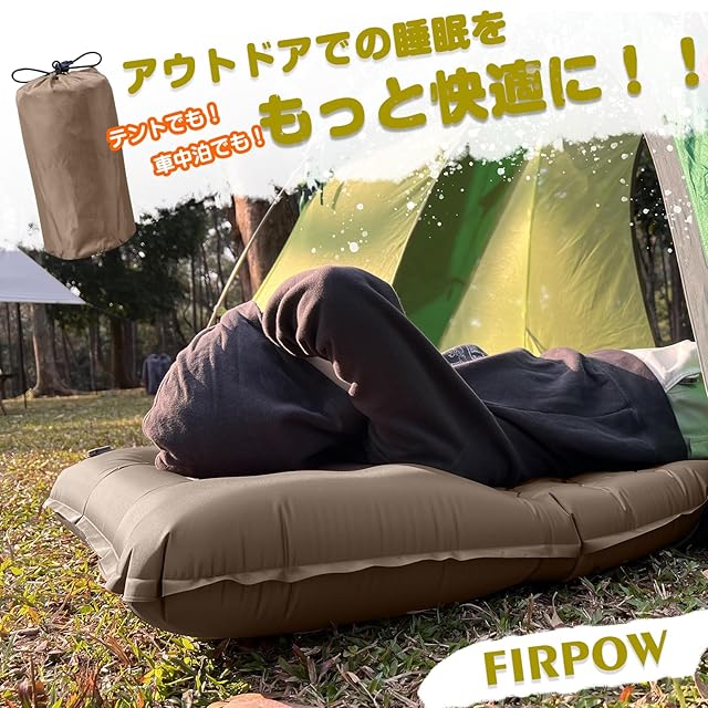 【 枕一体式、寝心地よい独特構造 】●人間工学に基づいて設計した枕を内蔵し、首や頸椎を自然な形にキープして、快適にぐっすり眠ります。別の枕を携帯する必要がないので、キャンプが便利になります。●FIRPOWエアーマットの厚さは10cmで、使用時に車内の段差や地面のゴツゴツ感が体に伝わらず、底つき感もなく、冬の気になる地面からの冷気もシャットアウトでき、寝心地が良い。